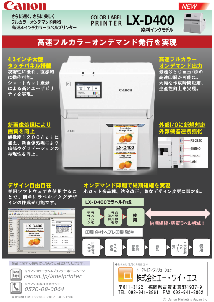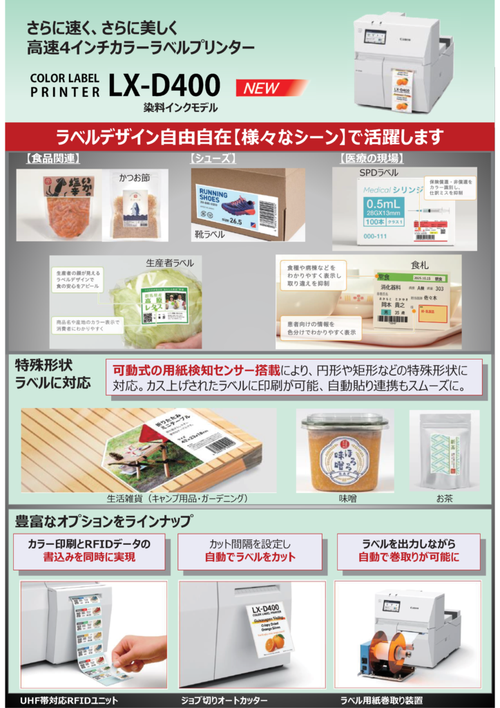 2026.04.24 「330mm/秒の瞬速ラベルプリントで、現場が動き出す。」 4月9日(木)より、現場の生産性向上に貢献するフルカラーラベルプリンター 「LX‑D400」 をご案内いたします。本製品は14年ぶりのフルモデルチェンジとなる新製品です。 LX-D400は生産性の向上、省人化、安定した品質管理において、多くの現場で効果が期待できるモデルです。 ⇒⇒ キヤノン 4インチ高速ラベルプリンター『LX-D400』 ご相談、お見積りはお気軽にお問い合せください。 一覧に戻る