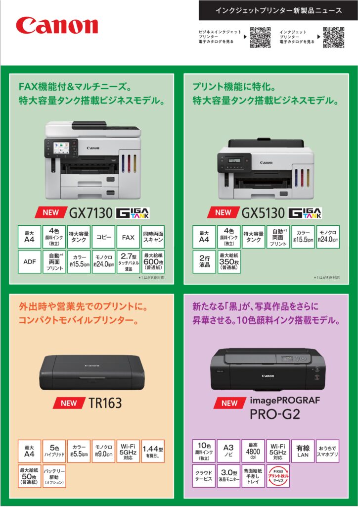 2025.04.14 キヤノン インクジェットプリンター新製品ニュース 2025春 キヤノンは、インクジェットプリンターの新製品として、特大容量タンク「GIGA TANK(ギガタンク)」を搭載した“GX7130/GX5130”、モバイルプリンター“TR163”、A3ノビ対応フォトプリンター“PRO-G2/PRO-S1 MarkⅡ”の5モデルが2025年3月中旬に発売されました。 お気軽にお問合せください。 一覧に戻る
