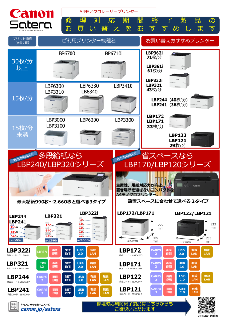 2026.02.03 キヤノン A4レーザープリンタ 修理期間終了製品のお知らせ キヤノン製品のA4レーザープリンタにて、修理対応期間が終了する製品がございます。 以下の一覧表をご参照ください。 対象のプリンタをお持ちの方は買い替えをおすすめいたします。 ご相談、お見積りはお気軽にお問い合わせください。 一覧に戻る